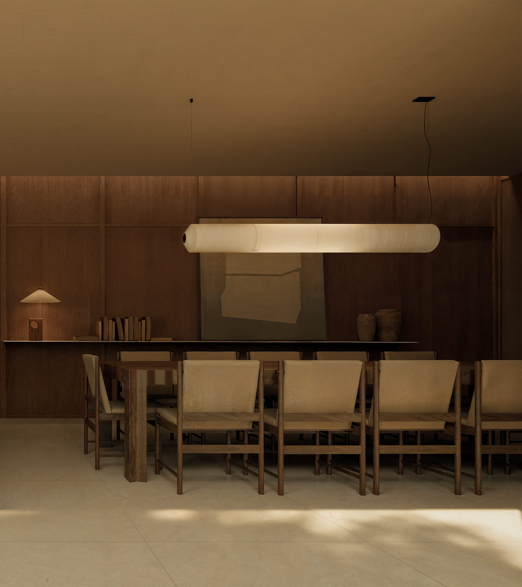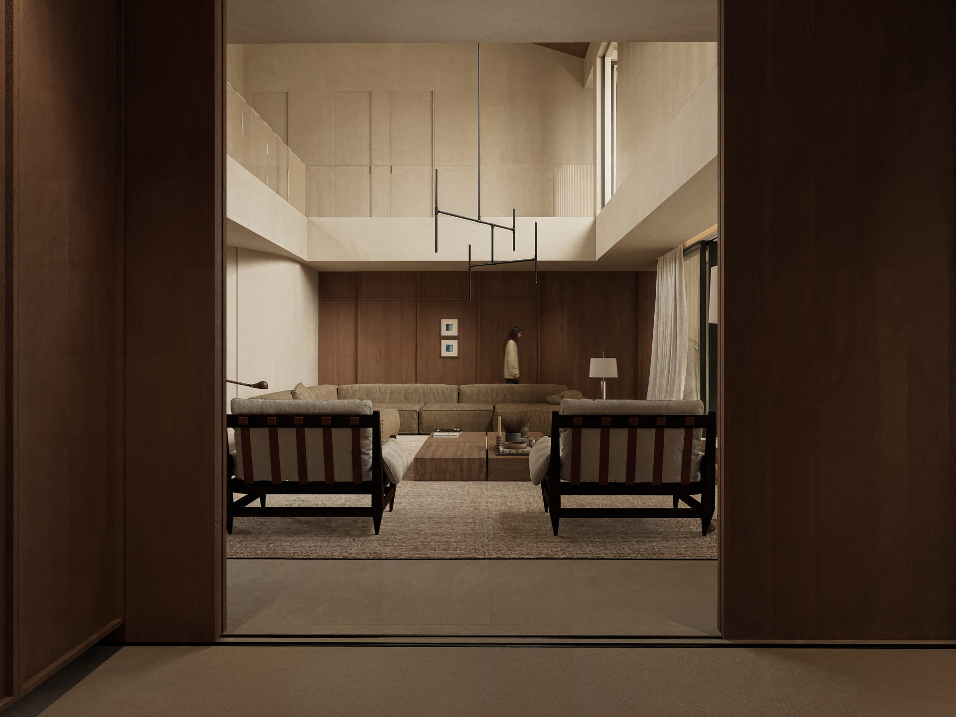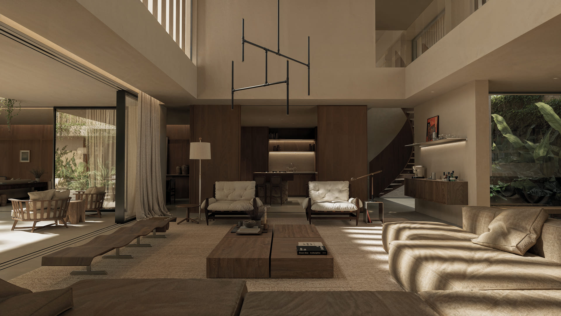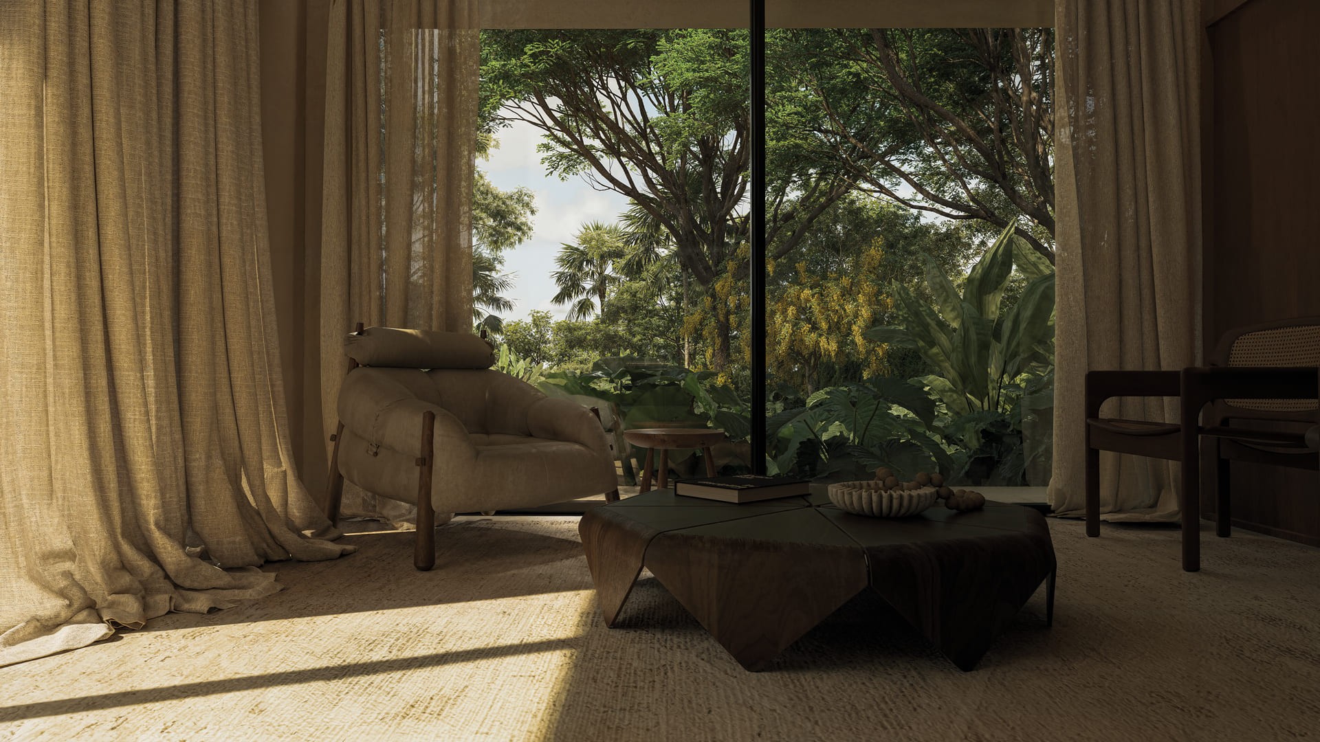 To develop a complete interior concept, from furniture selection to objects and overall atmosphere. The challenge was to create a strong authorial narrative aligned with the home’s monolithic architecture and the exclusive context of the site, while maintaining visual restraint and clarity.