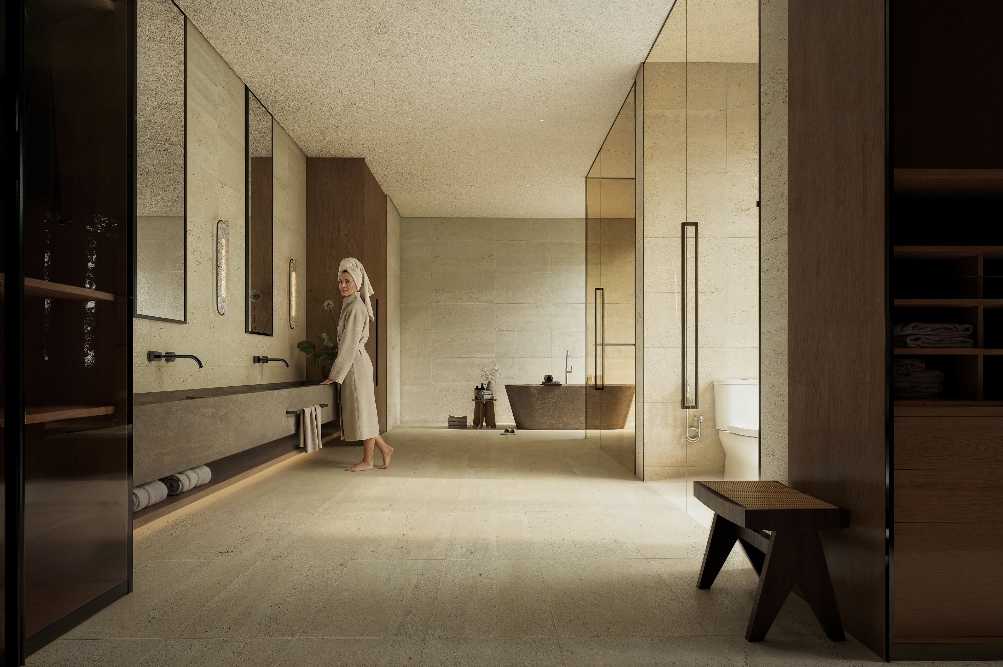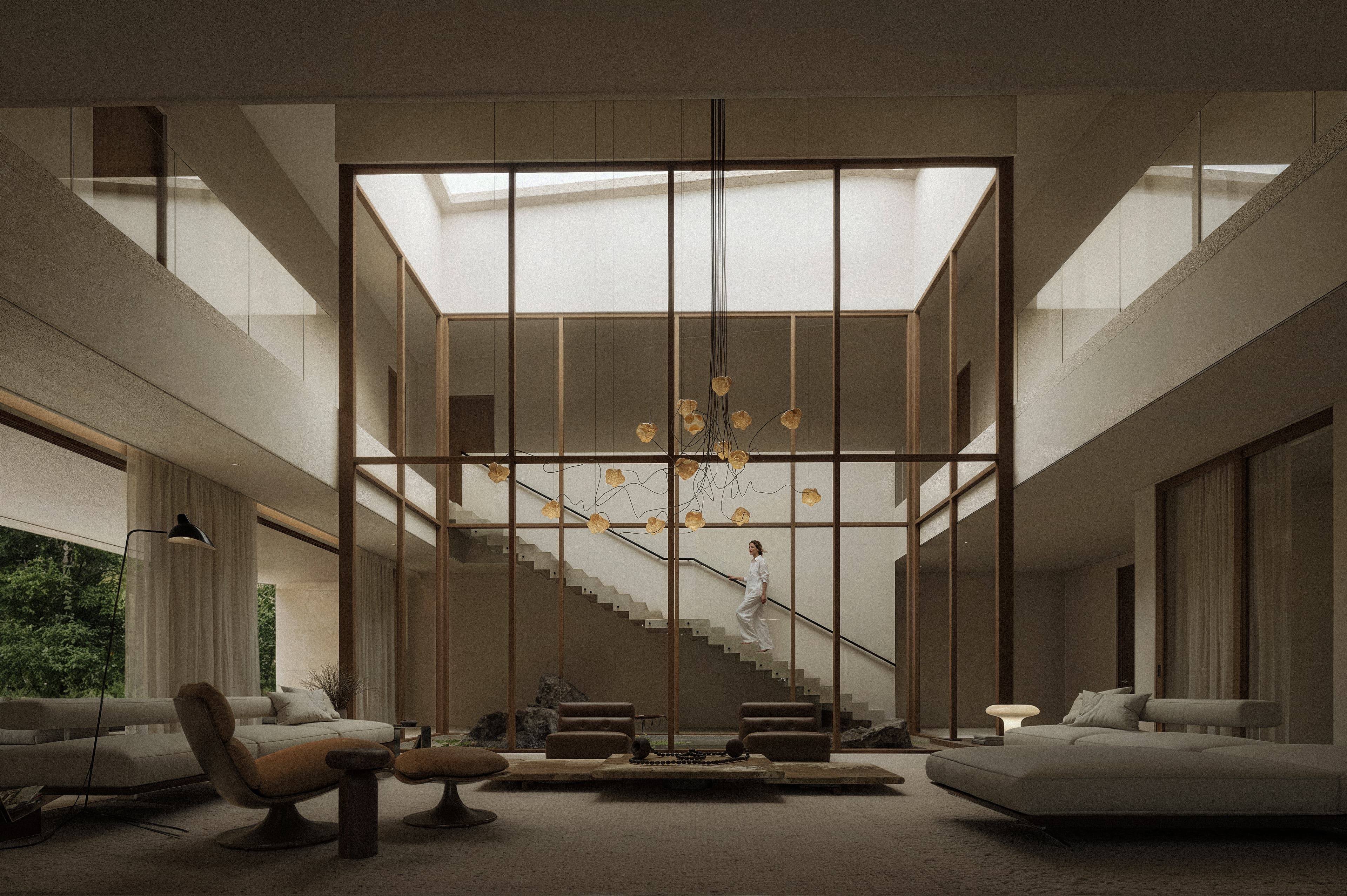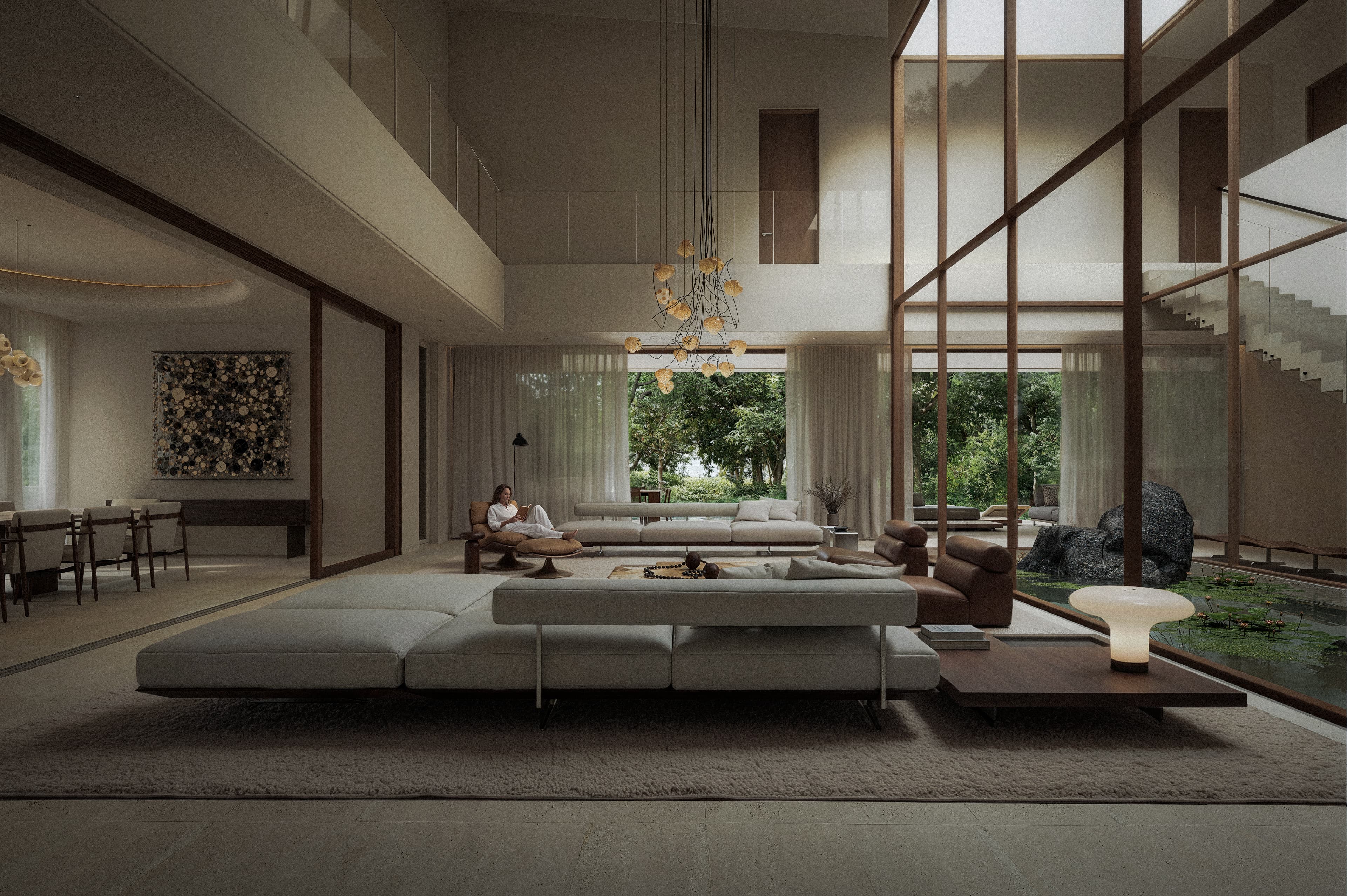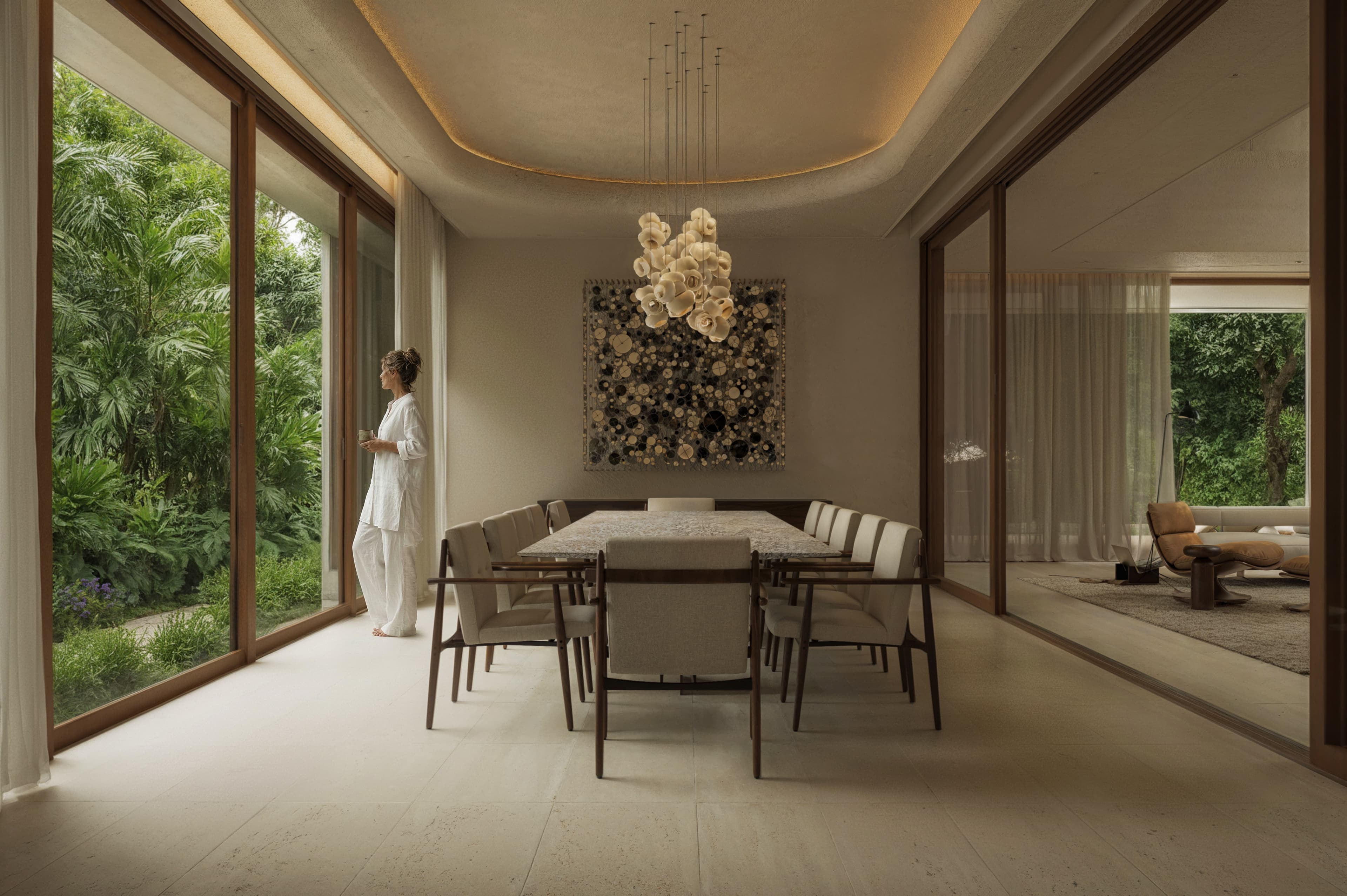 A linguagem visual combina superfícies de textura mineral, tons naturais e elementos de madeira que reforçam a conexão com o contexto tropical. A transparência dos planos de vidro amplia a relação com a paisagem, enquanto a iluminação indireta evidencia volumes e transições espaciais. O pé-direito duplo atua como elemento organizador da residência, permitindo que a luz natural se distribua de maneira uniforme e revele a materialidade dos ambientes. A composição privilegia linhas horizontais e planos contínuos, criando uma arquitetura serena, onde o ritmo da luz define a percepção dos espaços.