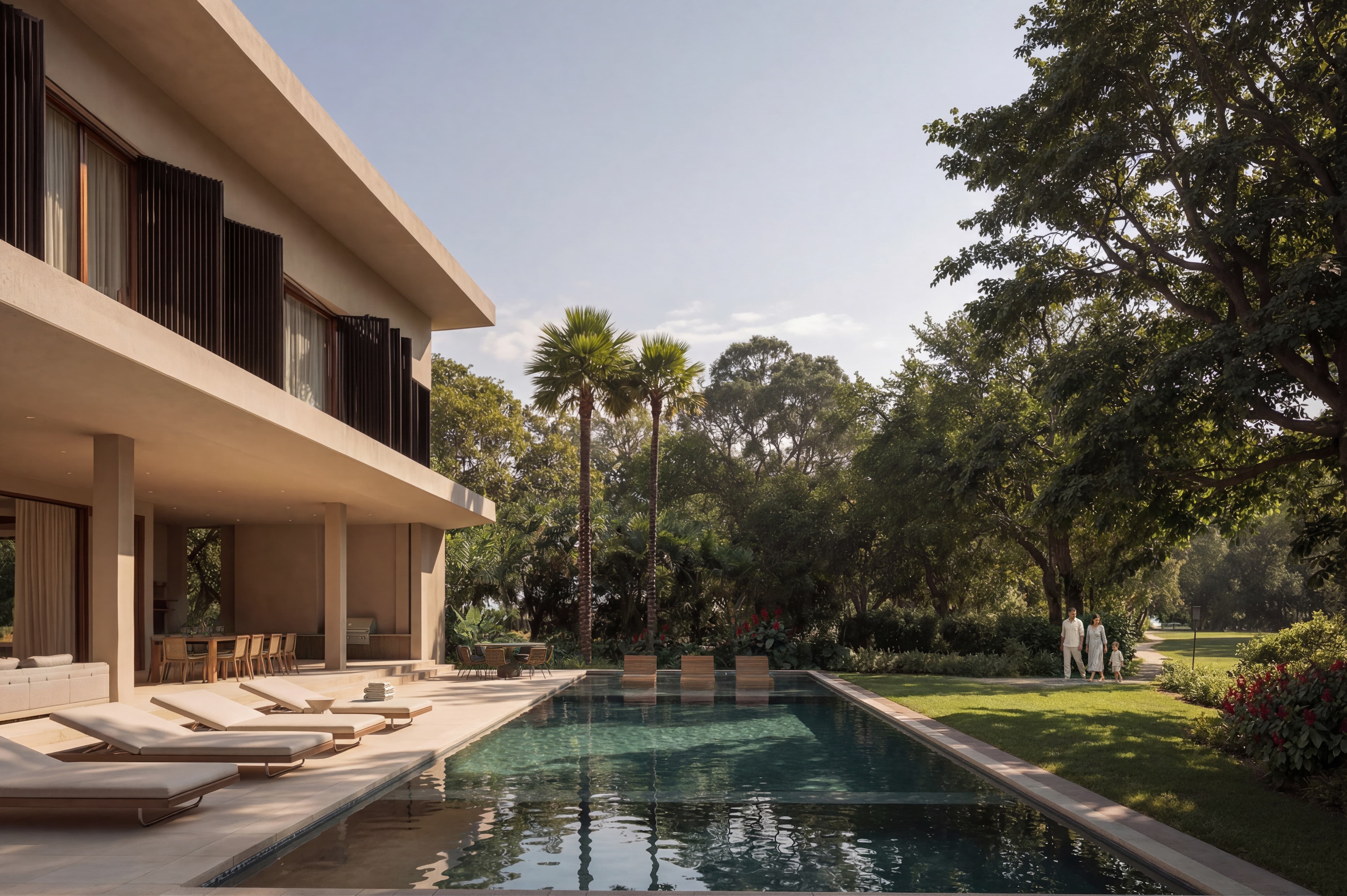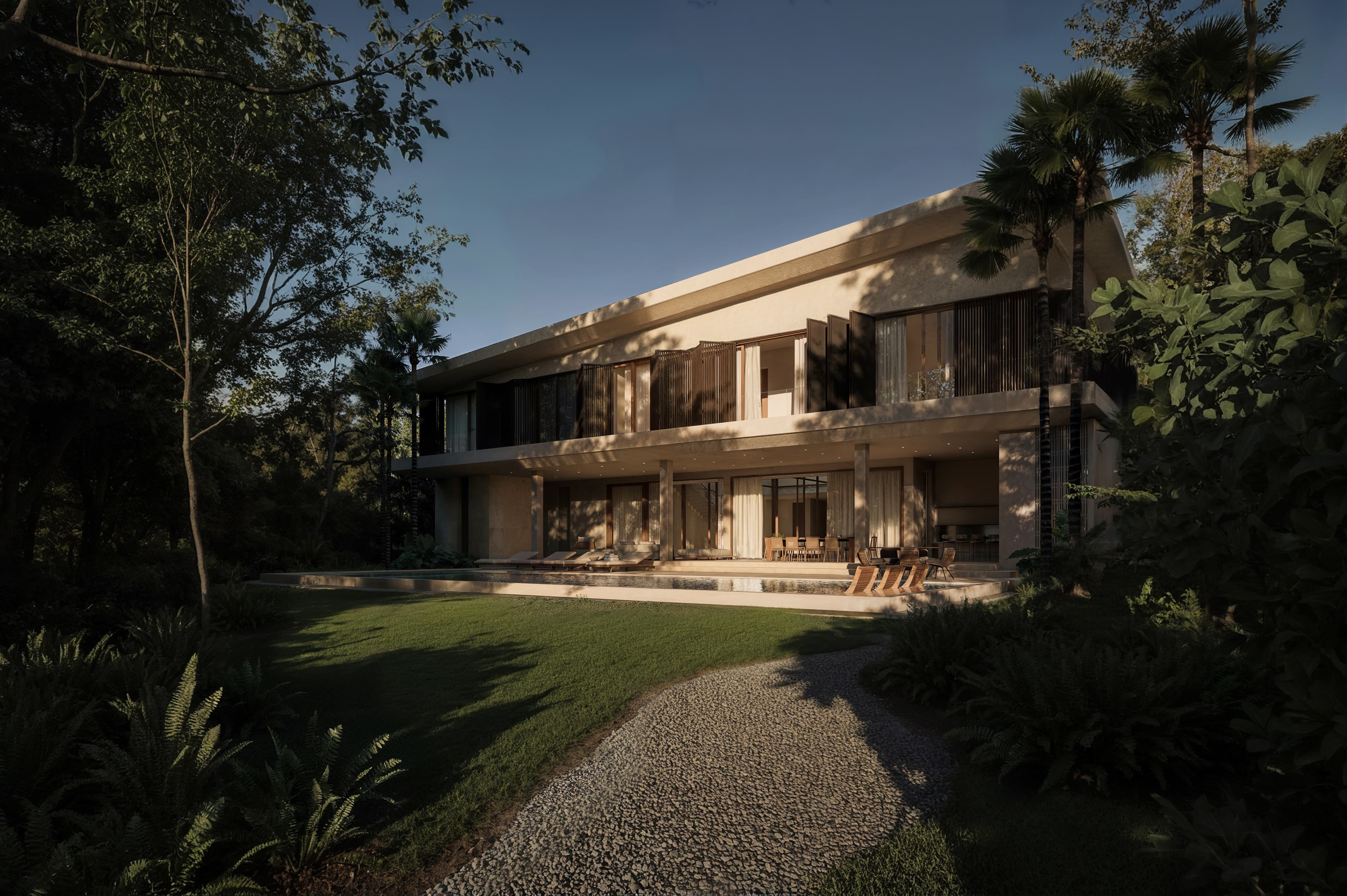 O desafio consistiu em organizar uma residência de grande escala mantendo clareza conceitual e coerência espacial. A proposta buscou sintetizar diferentes atmosferas em uma única narrativa arquitetônica, garantindo que cada ambiente expressasse a mesma essência tropical e contemporânea. O projeto exigiu controle cuidadoso de proporções, materiais e incidência de luz natural, assegurando uma experiência contínua e equilibrada entre monumentalidade e acolhimento.